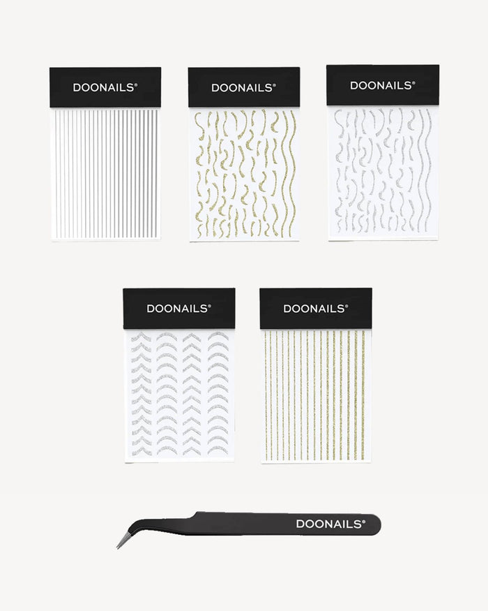 Bundel nagelstickers en pincet voor creatieve nageldesigns.