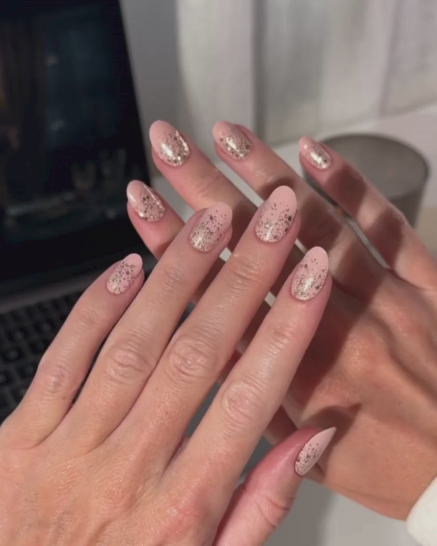 Dit design maakt indruk met een glinsterende gouden ombré en zet je vingertoppen in de schijnwerpers! Dus als je niet zonder een snufje glitter & glam wilt in je dagelijkse leven, zul je gegarandeerd blij zijn met deze look.