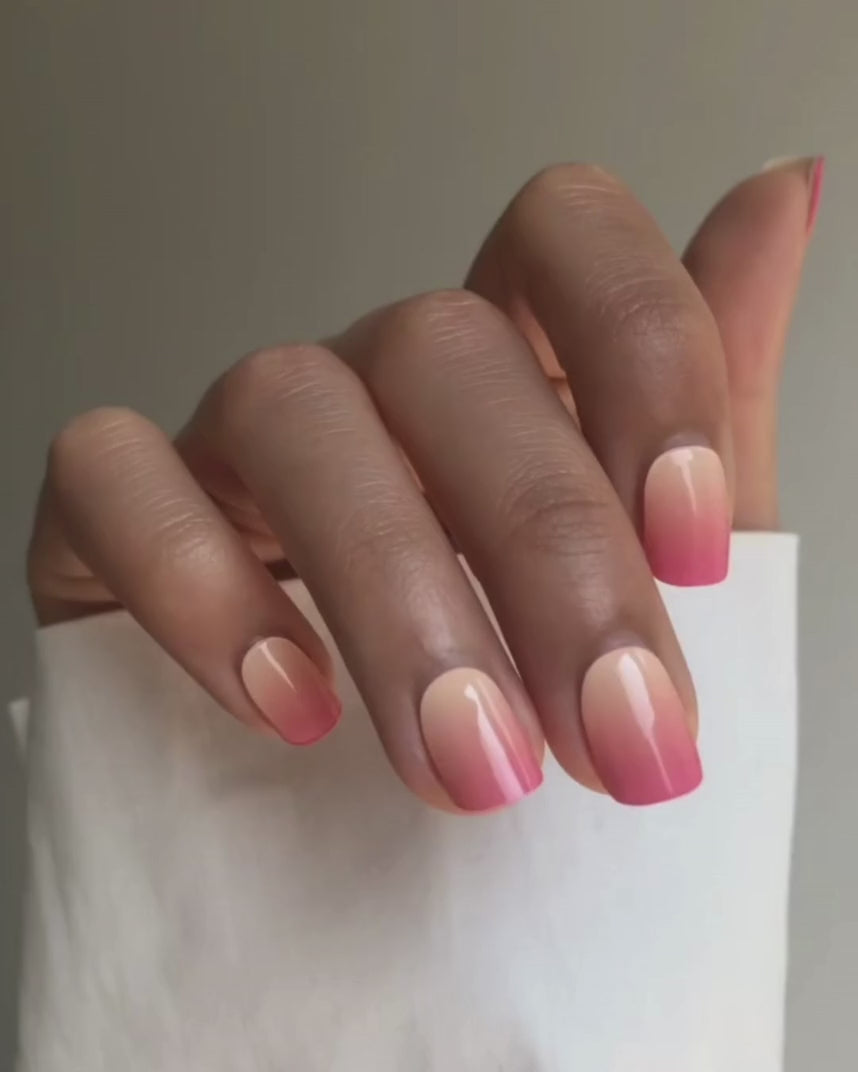 Een subtiele overgang van perzik naar roze geeft je nagels een vrouwelijke en elegante uitstraling. Perfect voor een natuurlijke stijl met een vleugje zomerse frisheid.